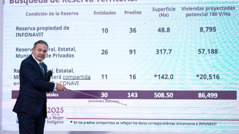 Señaló que el Instituto ya cuenta con reserva territorial en 30 estados, con 143 predios, en los que se podrían construir 86 mil 499 viviendas. Agregó que en el primer trimestre del año se tendrán listos 114 proyectos arquitectónicos para poder iniciar con la edificación de viviendas en 26 estados, una vez que se apruebe la reforma a Ley del Infonavit.