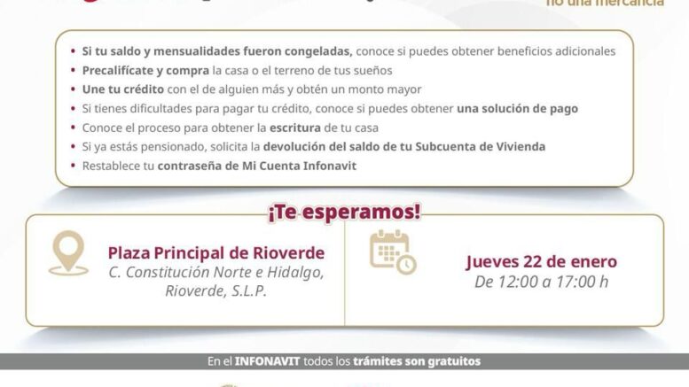 El INFONAVIT realizará su Brigada de Promoción y Servicio en el municipio Rioverde, en San Luis Potosí, con el objetivo de acercar sus programas y opciones de pago a las personas derechohabientes que enfrenten dificultades económicas.