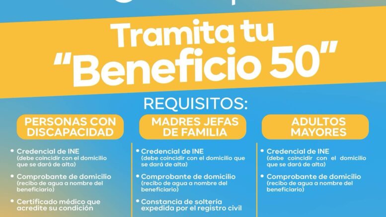 El programa “Beneficio 50” sigue vigente y ofrece un descuento del 50 por ciento en el pago del servicio de agua para adultos mayores, madres solteras y personas con discapacidad, en los primeros 25 metros cúbicos de consumo bimestral.