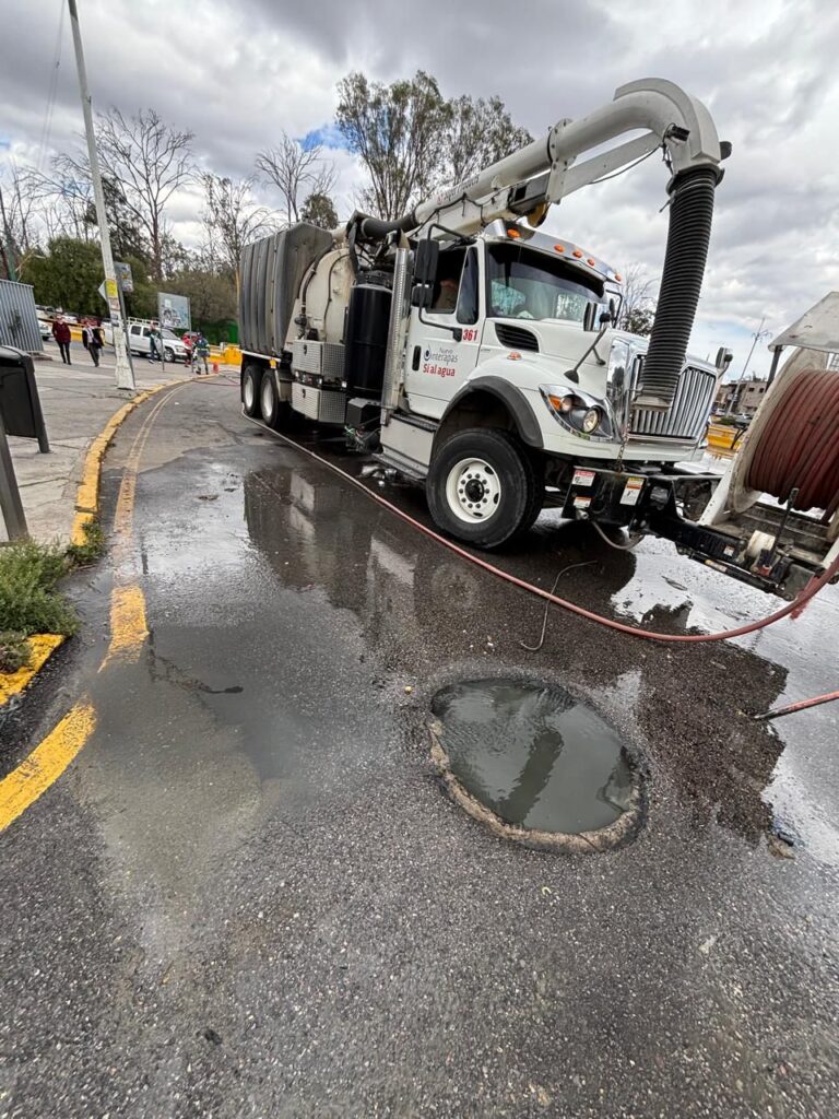 SLP.- Personal de Interapas atendió una fuga de aguas residuales y realizó trabajos de limpieza y desazolve en la red sanitaria de la glorieta Bocanegra, donde se detectó un taponamiento provocado por la acumulación de basura.
