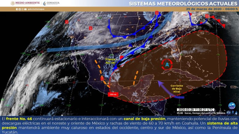 Para hoy, el frente No. 46 se extenderá como estacionario sobre el noreste del país, continuará interactuando con un canal de baja presión, manteniendo el potencial de lluvias con descargas eléctricas y vientos fuertes en el noreste y oriente de México. Finalmente, un sistema de alta presión mantendrá ambiente muy caluroso con temperaturas máximas superiores a 35°C en 17 estados del país.