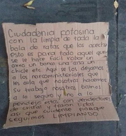 Todo indica que el mensaje anónimo dejado con los partes de cuerpo, y escrito sobre cartón, refiere una supuesta “limpia” de delincuentes. Donde se presume tienenevinculos con autoridad ministeriales : “Aquí se los dejamos a los marco ministeriales que les cala que nosotros hacemos su trabajo”.