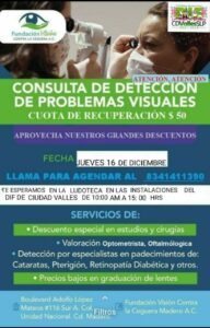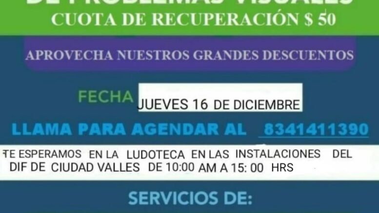 Ciudad Valles, S.L.P.- El Sistema Municipal DIF y la Dirección de Servicios Municipales de Salud del Ayuntamiento de Ciudad Valles invitan a la población en general a las Consultas de Detección de Problemas Visuales, el próximo jueves 16 de diciembre a una brigada que tendrá lugar en las instalaciones del SMDIF.