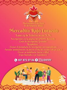 También a la par el lunes 14 de febrero se celebrara el Mercadito Rojo Corazón en el que emprendedores locales venderán objetos por el Día del Amor y la Amistad. Para inscribirse es necesario llenar un formulario en el siguiente link: https://forms.gle/d8gQ9SgyzPb4BDSe6 y los requisitos es llevar su mobiliario e instalarse a a partir de las 8:30 a.m.