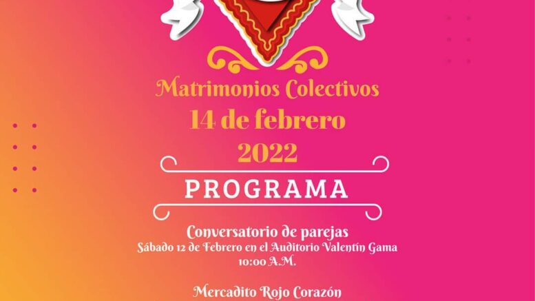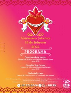 La presidenta del organismo Karina Quintero de Urbiola dio a conocer que habrá un conservatorio con las parejas inscritas el sábado 12 de febrero a las 10:00 de la mañana con los temas del compromiso, donde se hablará de la importancia del Acta de Matrimonio; el amor y la responsabilidad en el Auditorio Valentín Gama.