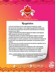 El DIF Rioverde y Registro Civil Municipal invitan a las parejas que quieran formalizar su relación participar en la campaña de bodas colectivas “Amor del Bueno” que serán celebradas el próximo 14 de febrero en punto de las 11:00 de la mañana en la plaza de San Antonio en la zona centro de Rioverde.