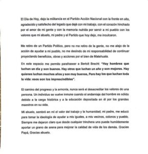 Agradeció la afinidad política y partidista que lo unió a mujeres y hombres que defendieron y sirvieron al PAN. Solicitó al presidente del Comité Directivo Municipal del PAN, Reynaldo Cruz Llanas, que se inicien las gestiones y trámites para finalizar su relación con el partido, solicitando la retirada de su nombre de los registros y listados del padrón de militantes del PAN, y dando vista al Instituto Nacional Electoral para lo conducente.