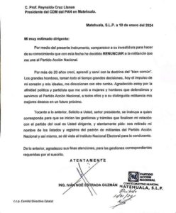 El exalcalde de Matehuala, Iván Estrada Guzmán, vinculado a proceso por ejercicio abusivo de funciones y presunta relación con grupos de crimen organizado, presentó su renuncia al Partido Acción Nacional (PAN) el 10 de enero.
