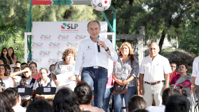 Posteriormente, en la localidad Puente del Carmen, perteneciente al municipio de Rioverde, acompañado por el edil José Ramón Torres García, el mandatario estatal entregó los certificados de inclusión para el arranque de la construcción de 4 techados de patios cívicos y la primera etapa de 10 más en 14 planteles escolares y 2 canchas públicas de localidades de este municipio, con una inversión total de 10 millones de pesos, en beneficio de más de 9 mil alumnos.