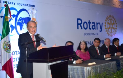 Sostuvo que en Rotary International somos la mayor organización de servicio a nivel mundial, por lo que en San Luis Potosí llevamos el programa “Peso x peso, acción por acción” con el Gobernador del Estado, Juan Manuel Carreras López, “quien apoya este tipo de iniciativas, como la donación de aparatos auditivos, sillas de ruedas, operaciones de paladar hendido, cardiopatías congénitas, detección oportuna de cáncer de cérvico-uterino y mama, equipamiento del Hospital Central y su albergue; plantas tratadoras de aguas residuales, líneas de conducción, apoyo a escuelas en la construcción y equipamiento de aulas”.