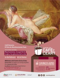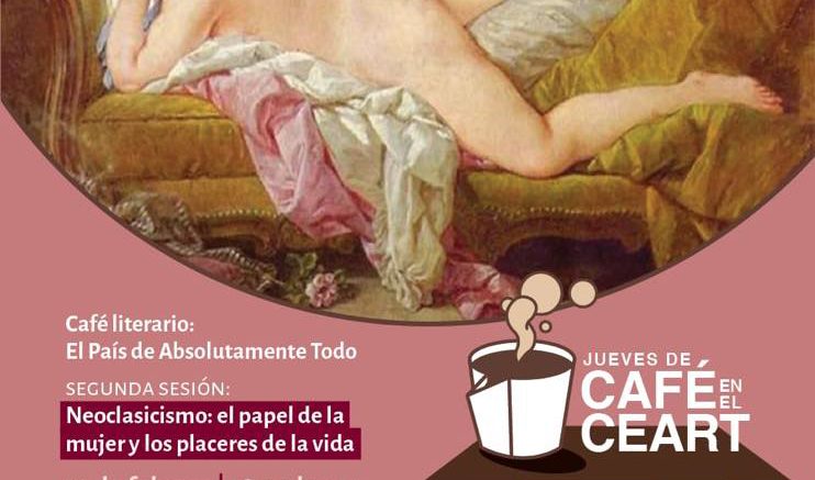 El Café literario “El país de absolutamente todo”, que será coordinado por Hernán Samir y Rocío Arellano, se llevará a cabo todos los jueves en un horario de 18:00 a 19:30 horas en la Biblioteca del CEART. El jueves 21 de febrero el tema será “Neoclasicismo: el papel de la mujer y los placeres de la vida”, y el jueves 28 el “Romanticismo”.