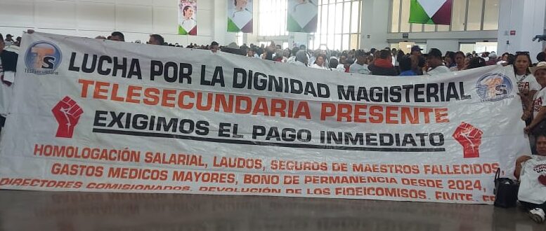La tensión se mascaba en el aire. Cuando comenzaron a llegar los maestros, el recinto se volcó: más de 3 mil docentes llenaron el lugar al grito de “¡SNTE, SNTE, SNTE!”. Con lonas en mano, exigieron el pago de la deuda que supera los mil millones de pesos que el gobierno estatal mantiene con ellos.