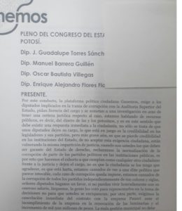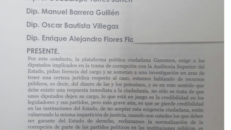 El grupo de integrantes de la plataforma política ciudadana ganemos , exigieron mediante un escrito a los diputados señalados en el video de corrupcion publicado por el periódico Pulso de San Luis la semana pasada que pidan licencia a su cargo y se sometan a una investigación en aras de tener la certeza jurídica y se sometan al escrutinio de las autoridades de procuración de justicia del estado.