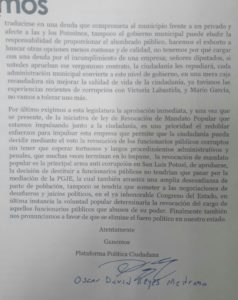 El escrito pide a los diputados “señores diputados háganos un favor , si no pueden vivir honradamente con su oneroso salario , lárguense,la gente les voto. Para representarlos en la toma de desicion es , no para que ustedes se enriquezcan.
