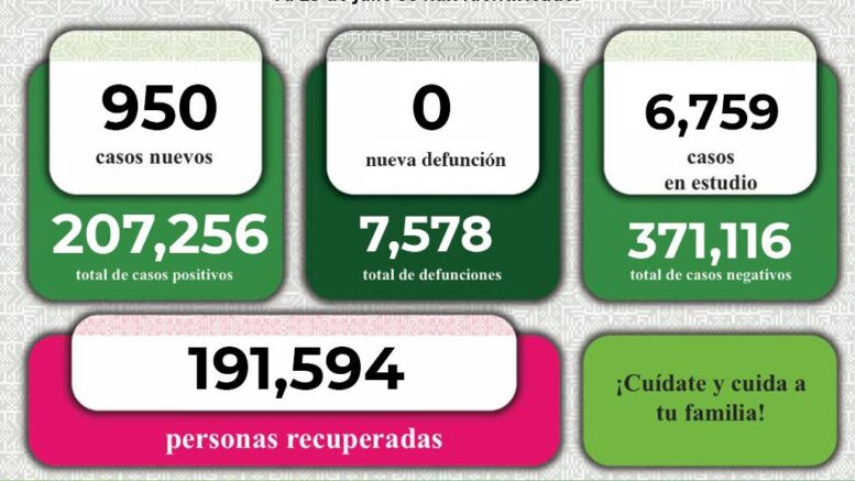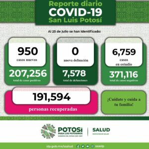 Este lunes 25 de julio, el Comité Estatal para la Seguridad en Salud y los Servicios de Salud dan a conocer 950 contagios confirmados de Covid-19 en la entidad. De esta forma, se registran 207 mil 256 casos totales de este padecimiento.