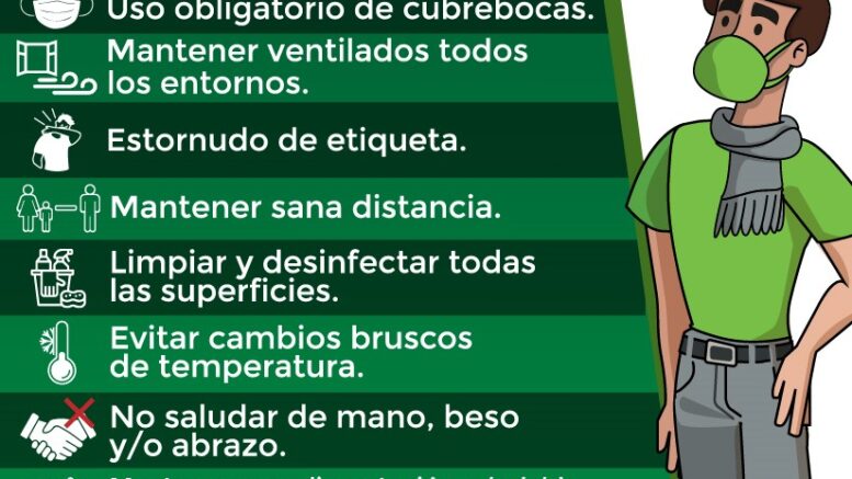 Por lo que reiteró lo siguiente, ¿qué tenemos que hacer para proteger nuestra salud?, sencillamente empezaremos con lo más elemental: practicar el lavado frecuente de manos, hacer uso obligatorio del cubrebocas; es importante mantener ventilado todos los entornos; recordar realizar el estornudo de etiqueta (taparse la boca con el ángulo interno del codo al toser o estornudar); mantener la sana distancia; limpiar y desinfectar todas las superficies; evitar cambios bruscos de temperatura.