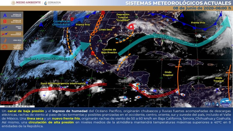 Viento con rachas de 50 a 60 km/h: Baja California, Sonora, Chihuahua, Durango, Coahuila, Veracruz, Oaxaca y Chiapas.