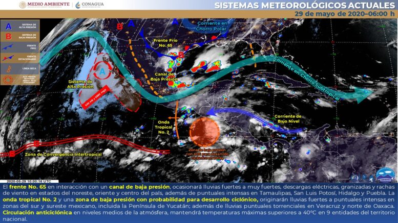 Este día el frente No. 65 en interacción con un canal de baja presión sobre el oriente de México, ocasionará lluvias fuertes a muy fuertes en los estados del noreste, oriente y centro del país, además de puntuales intensas en Tamaulipas, San Luis Potosí, Hidalgo y Puebla, todas acompañadas de descargas eléctricas, granizadas y rachas de viento durante el paso de las tormentas. La onda tropical No. 2, será absorbida por una zona de baja presión con probabilidad para desarrollo ciclónico y originará lluvias fuertes a puntuales intensas en zonas del sur y sureste mexicano, incluida la Península de Yucatán, además de lluvias puntuales torrenciales en Veracruz y norte de Oaxaca; precipitaciones que podrían generar posibles deslaves, aumento en los caudales de ríos y arroyos e inundaciones en zonas bajas de dichos estados. Finalmente, una circulación anticiclónica en niveles medios de la atmósfera, mantendrá temperaturas máximas superiores a 40°C en 9 entidades del territorio nacional.