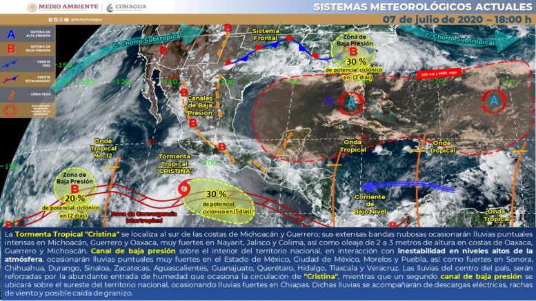 Para esta noche y madrugada la Tormenta tropical “Cristina” se desplazará al sur de las costas de Michoacán, sus extensas bandas nubosas ocasionarán lluvias puntuales intensas en Michoacán, Guerrero y Oaxaca, muy fuertes en Nayarit, Jalisco y Colima, acompañadas de descargas eléctricas y rachas de viento 60 a 70 km/h, además de oleaje elevado de 2 a 3 metros de altura a lo largo de las costas de Oaxaca, Guerrero y Michoacán. Por otro lado, un canal de baja presión sobre el interior del territorio nacional, en interacción con inestabilidad en niveles altos de la atmósfera, ocasionarán lluvias puntuales muy fuertes en el Estado de México, Ciudad de México, Morelos y Puebla, así como fuertes en Sonora, Chihuahua, Durango, Sinaloa, Zacatecas, Aguascalientes, Guanajuato, Querétaro, Hidalgo, Tlaxcala y Veracruz, acompañadas de descargas eléctricas, rachas de viento y posibles granizadas. Las lluvias del centro del país, serán reforzadas por la abundante entrada de humedad que ocasiona la circulación de “Cristina”, mientras que un segundo canal de baja presión de ubicará sobre el sureste del territorio nacional, ocasionando lluvias fuertes acompañadas de descargas eléctricas en Chiapas.