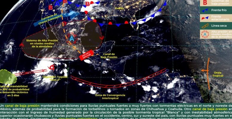 México.- Para hoy, un canal de baja presión mantendrá condiciones para lluvias puntuales fuertes a muy fuertes con tormentas eléctricas en el norte y noreste de México, además de probabilidad para la formación de torbellinos o tornados en zonas de Chihuahua y Coahuila. Otro canal de baja presión en interacción con el ingreso de humedad generado por la circulación de la posible tormenta tropical “Blanca” en Océano Pacífico y con inestabilidad atmosférica superior ocasionarán chubascos y lluvias puntuales fuertes con descargas eléctricas y posible caída de granizo en el occidente, centro, sur y sureste del país, con lluvias puntuales muy fuertes en Estado de México. Finalmente, una circulación anticiclónica en niveles medios de la atmósfera mantendrá ambiente caluroso sobre el noroeste, noreste, sur y sureste de la República Mexicana, incluida la Península de Yucatán y muy caluroso en zonas de Michoacán.