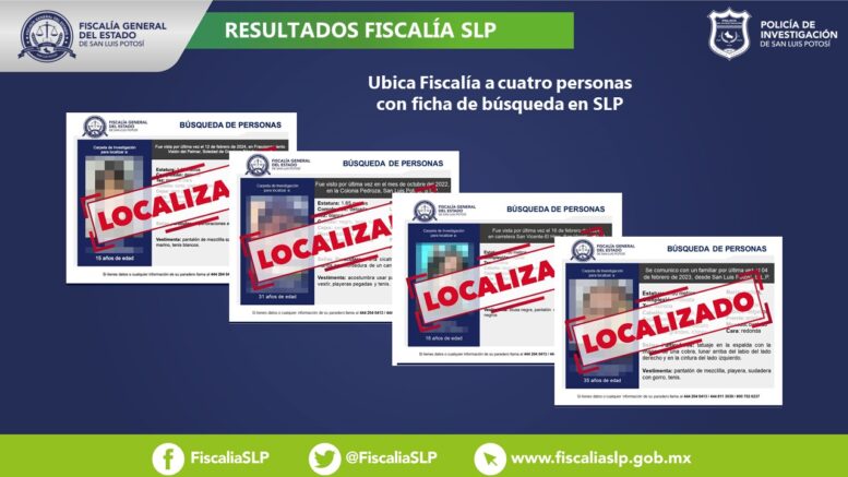 A través de distintas acciones, cuatro personas que eran buscadas en territorio potosino fueron encontradas por agentes de la Dirección General de Métodos de Investigación (DGMI), informó la Fiscalía General del Estado de San Luis Potosí (FGESLP).
