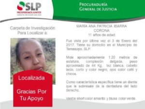 Uno de los casos es el de María Ana, una menor de 11 años de edad, habitante del municipio de Tamasopo, quien era buscada por sus familiares desde el pasado 25 de diciembre del 2016, sin embargo, solicitaron la intervención de la autoridad, hasta el día 6 de enero de este 2017.