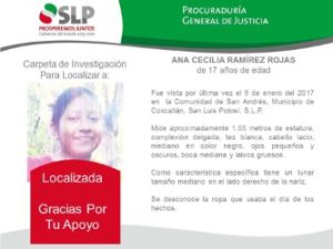 Por otro lado, se localizó a una joven de 17 años de edad de nombre Ana Cecilia y habitante de Coxcatlán, quien era buscada desde el pasado 5 de enero cuando salió de su domicilio y ya no regresó, por lo que sus familiares acudieron un día después ante la autoridad para solicitar la búsqueda correspondiente.