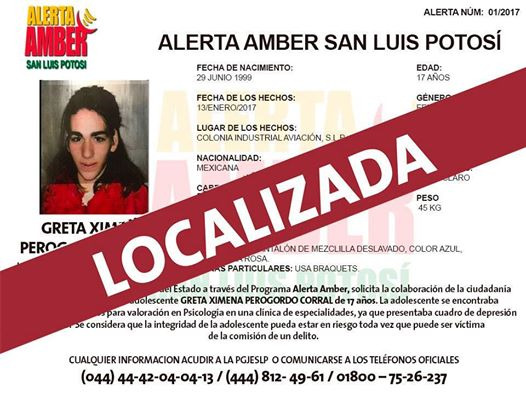 Derivado de un operativo de la Procuraduría General de Justicia de San Luis Potosí (PGJE), a través de la Policía Ministerial del Estado (PME), fue localizada este mediodía, la menor Greta Ximena de 17 años, quien se encontraba extraviada desde el pasado 13 de enero de 2017 de la colonia Industria Aviación de la capital potosina.