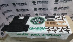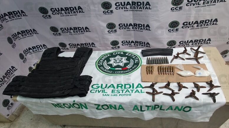 También se aseguró un chaleco táctico, un cargador, dos dosis de la droga sintética conocida como “cristal” y 13 artefactos metálicos conocidos como poncha llantas y 20 cartuchos útiles, calibres .223 y .308.
