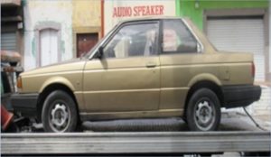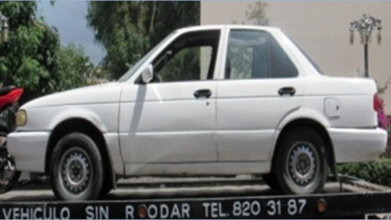 La primera unidad fue localizada en la calle Primero de Mayo, en Ciudad Satélite. Se trata de un Nissan Tsuru, modelo 2005, color blanco, con placas del estado de Tabasco y con reporte de robo del 22 de julio de 2017. Fue encontrado sin acumulador, equipo de sonido, radiador y sin seguros en las puertas.