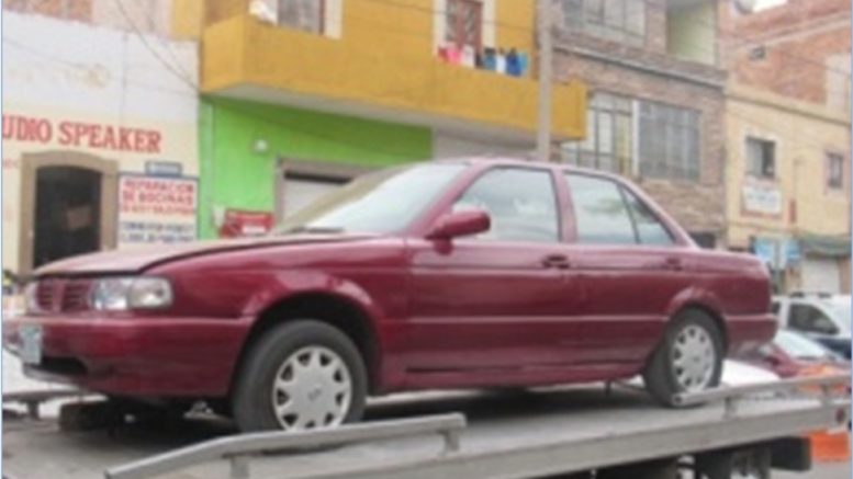 La primera unidad fue localizada en las calles torre Eiffel y la Avenida Morales Saucito, en el Fraccionamiento Torres de México. Se trata de un Nissan Tsuru, modelo 2008, color vino, con placas de San Luis Potosí, con reporte de robo del 4 de abril de 2017. Fue hallado sin equipo de sonido, acumulador y partes del motor.
