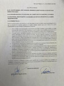 En aras de construir y consolidar las luchas históricas de la izquierda en San Luis Potosí, en las cuales las aspirantes convocadas han participado activamente durante su trayectoria política, hacen un llamado a la militancia, simpatizantes y ciudadanía para establecer un acuerdo de unidad y se elija el perfil que más represente los valores y aspiraciones de Morena.