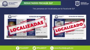 La Fiscalía General del Estado de San Luis Potosí (FGESLP) informó sobre la localización de tres personas en la entidad.