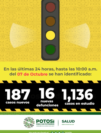 La Secretaría de Salud de San Luis Potosí y el Comité Estatal para la Seguridad en Salud, informan que, hasta este jueves 7 de octubre se registran 98 mil 482 casos totales de Covid-19, con la confirmación de 187 nuevos contagios en las últimas 24 horas.