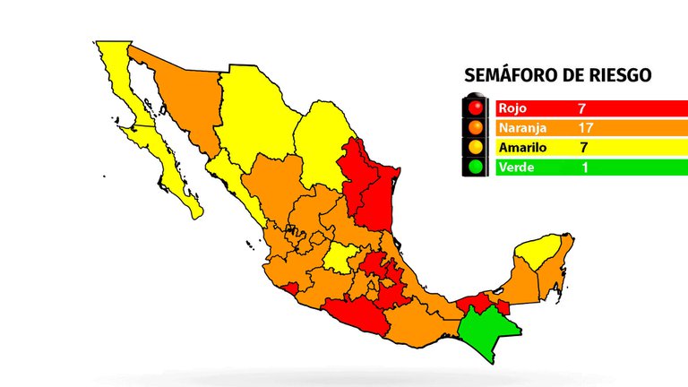 Según los nuevos colores del semáforo epidemiológico que entran en vigor a partir de este lunes y que estarán vigentes hasta el próximo 5 de septiembre, siete estados permanecen en rojo (riesgo máximo de contagio): Colima, Guerrero, Puebla, Hidalgo, Tabasco, Tamaulipas y Nuevo León.