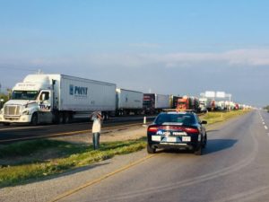 La mañana de hoy más de mil Productores de granos de las cadenas nacionales productivas cerraron la carretera 57 en el entronque a Villa de Arista .