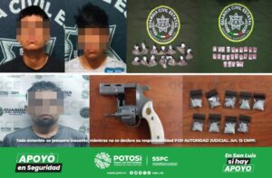 Por su parte, en el municipio de Soledad de Graciano Sánchez, tres probables narcomenudistas fueron capturados, en la colonia San Francisco se ubicó a Moisés “N” de 23 años de edad, detenido luego de asegurarle 10 dosis de “cristal”; a su vez, en la colonia 21 de Marzo, elementos de la GCE capturaron a un supuesto objetivo criminal, identificado como Edgar “N” de 28 años, tras notar la presencia policiaca dicha persona intentó huir de la zona, sin embargo fue detenido metros más adelante al asegurarle nueve dosis de “cristal” y un arma de utilería.