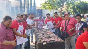 Todo comenzó al mediodía cuando el presidente municipal, Guillermo Mendieta Méndez con jefes de departamento y personal de la administración, comenzaron a encender los asadores en uno de los pasillos centrales y alterno de la plaza principal, para asar la carne. En total se distribuyeron más de 150 kilos, además de salchichones, chorizo, nopalitos y elotes asados.