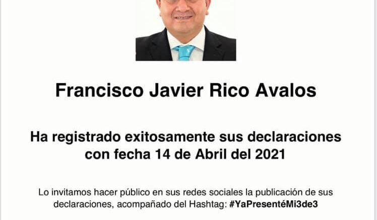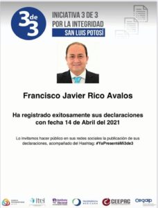 SAN LUIS POTOSÍ, S.L.P.- Francisco Javier Rico Ávalos, mejor conocido como el “Profe Rico, candidato a Gobernador de San Luis Potosí por Nueva Alianza, este miércoles 14 de abril refrendó su compromiso público al responder a las instituciones comprometidas con la transparencia y a organizaciones civiles, la solicitud a los candidatos que contienden a un cargo de elección popular, transparentar sus bienes y presentar su declaración #3de3.