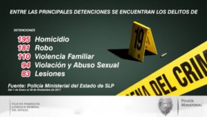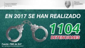 Del primero de enero al 30 de noviembre de este 2017, la Procuraduría General de Justicia, en transición a Fiscalía General, logró la detención de mil 104 personas por diversos delitos en toda la entidad, principalmente por los ilícitos de homicidio, robo, secuestro, fraude, violación y lesiones, con lo que también se desintegraron peligrosas bandas que asolaban a los potosinos.
