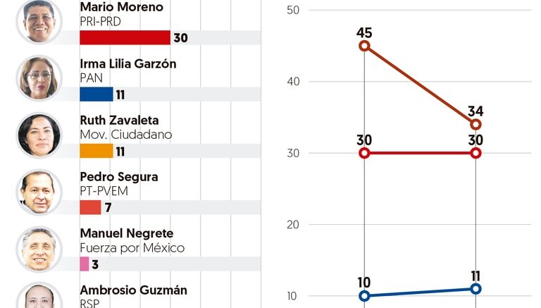 De acuerdo con las encuestas realizadas por El Financiero, en la citada entidad el partido guinda aventaja solo por cuatro puntos porcentuales (34 por ciento) a Mario Moreno, candidato del PRI-PRD, quien tiene 30 por ciento de la preferencia.