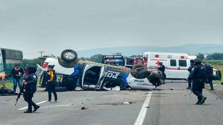Una patrulla de las Fuerzas de Seguridad Pública del Estado de Guanajuato (Fspeg) volcó sobre la carretera Abasolo-Pénjamo, dejando cuatro elementos muertos y 11 heridos.