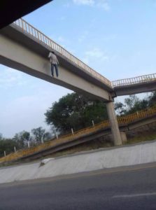 La colocación de “monos “de trapo En puentes peatonales y zonas de mayor afluencia vehicular de los municipios de Ciudad Valles, Ébano, Tamuín, y El Naranjo , integrantes del  movimiento huasteca democrático piden a SEDATU regresar tierras propiedad de campesinos y cimientos .