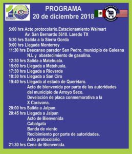 Cabe hacer mención que durante el recorrido se realizan únicamente dos paradas. La salida es el 20 de diciembre a las 5 de la mañana de Laredo Texas y la primera parada es en el parador San Pedro, el cual se ubica entre los límites del estado de San Luis Potosí y Nuevo León, la otra parada es en Rioverde S.L.P.; con una pequeña recepción y el resto de la caravana continúa por carretera de San Ciro hasta culminar en Jalpan Qro.