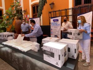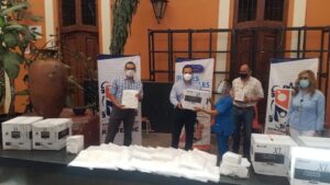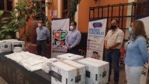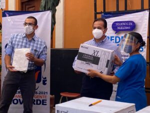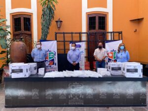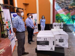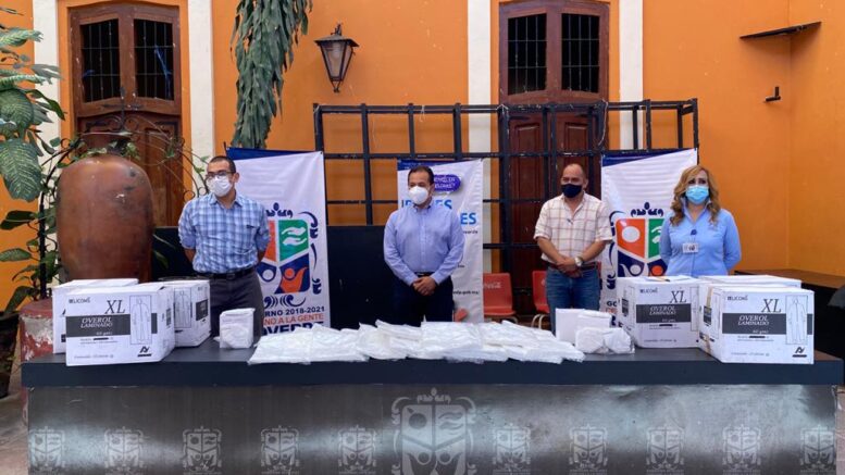 Contando con la presencia de del Dr. Alberto Hernán Rodríguez Pecina Director del Hospital General de Rioverde, la Enfermera Verónica Hernández Méndez jefa de enfermeras del HGRV, la Dra. Edith Reynaga Torres jefa del área de epidemiología del HGRV, la enfermera Juana Rodríguez Barragán enfermera del área COVID del HGRV, así como del Dr. Giovanni Christian Montes Mares jefe de la Jurisdicción Sanitaria No. IV y la Lic. Selene Paz Martínez jefa del departamento de Salud del Gobierno Municipal fueron entregados por el M.V.Z. José Ramón Torres García Presidente Municipal de Rioverde 150 overoles con capucha especiales y laminados con una aportación de $64,500.00 y 150 mascarillas respirador KN95 con una aportación de $14,250.00.