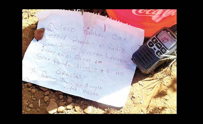 “Quiero hablar con usted. Prendan el radio. Cuando lo prenda hábleme, estoy en el canal 10. Si se puede arreglo y si no gracias. Si podemos tener un arreglo, usted manda”, se lee en la hoja de papel que fue hallada en una tienda de campaña utilizada por los sembradores.
