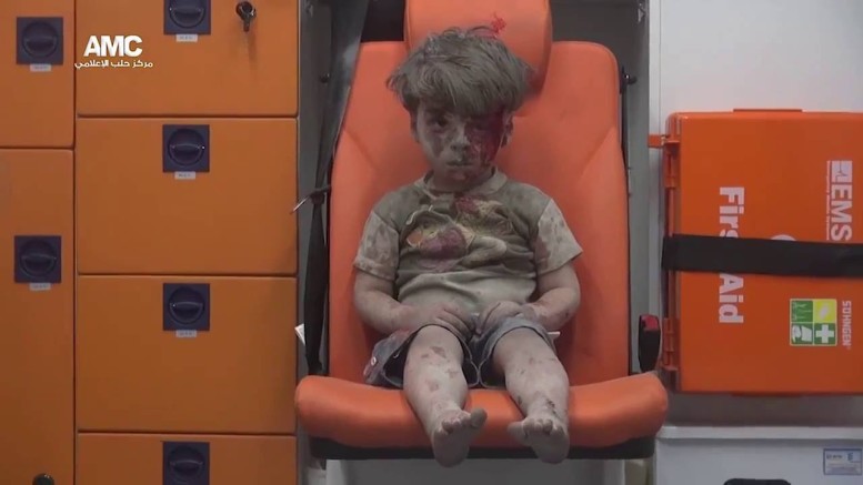 Omran Daqneesh, de 5 años de edad a conmocionado al mundo, luego de ser rescato de un ataque de la fuerza aérea de Siria en Alepo, el pequeño, ensangrentado de su rostro, lleno de polvo, es sentado en el interior de una ambulancia, se toca su rostro, pero no llora, ni se mueve, en espera de que los más miembros de su familia sean rescatados dentro de los escombros que dejo la destrucción.