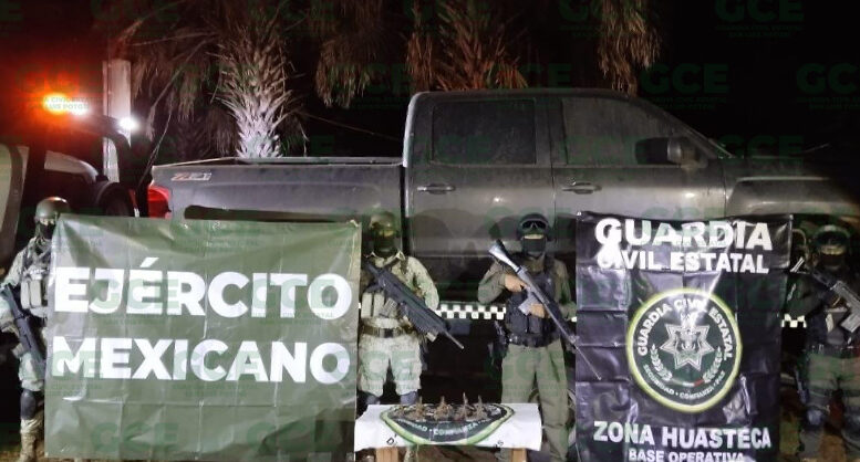El Naranjo, S.L.P.- Por medio de la Base de Operaciones Mixta Interinstitucional (BOMI) de la Guardia Civil Estatal y SEDENA, desplegada en la localidad La Presa, se llevó a cabo el aseguramiento de un vehículo, que presumiblemente es parte del parque vehicular de un grupo criminal, dentro del cual se aseguraron artefactos prohibidos.