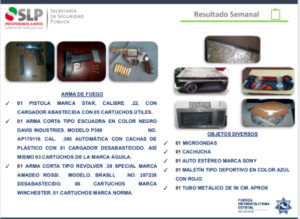 La Jefatura de Región de la Secretaría de Seguridad Pública del Estado en la Región Huasteca, informó que los resultados abarcan del periodo del 09 al 15 de mayo de 2020, esto, derivado de los operativos implementados en los 20 municipios de la zona, así como con el apoyo a la ciudadanía al reportar delitos al Sistema de Emergencia 9-1-1 y a la línea de Denuncia Anónima 089.