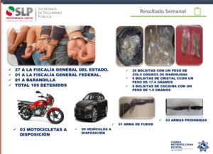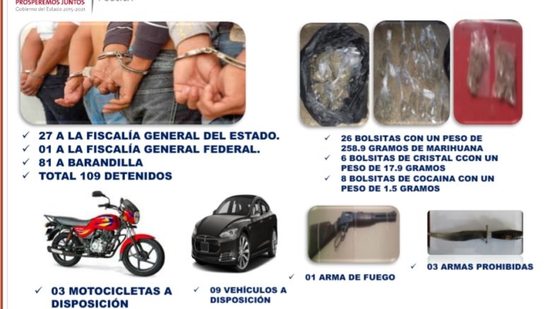 En este marco, por diversos delitos fueron puestas a disposición de la Fiscalía General del Estado 27 personas; una persona a disposición de la Fiscalía General Federal y 81 personas a Barandilla; además se aseguraron 26 bolsas de marihuana; seis dosis de la droga sintética cristal y ocho bolsitas con el enervante conocido como cocaína; aunado a esto, se pusieron a disposición tres motocicletas; nueve vehículos; un arma de fuego y tres armas prohibidas.